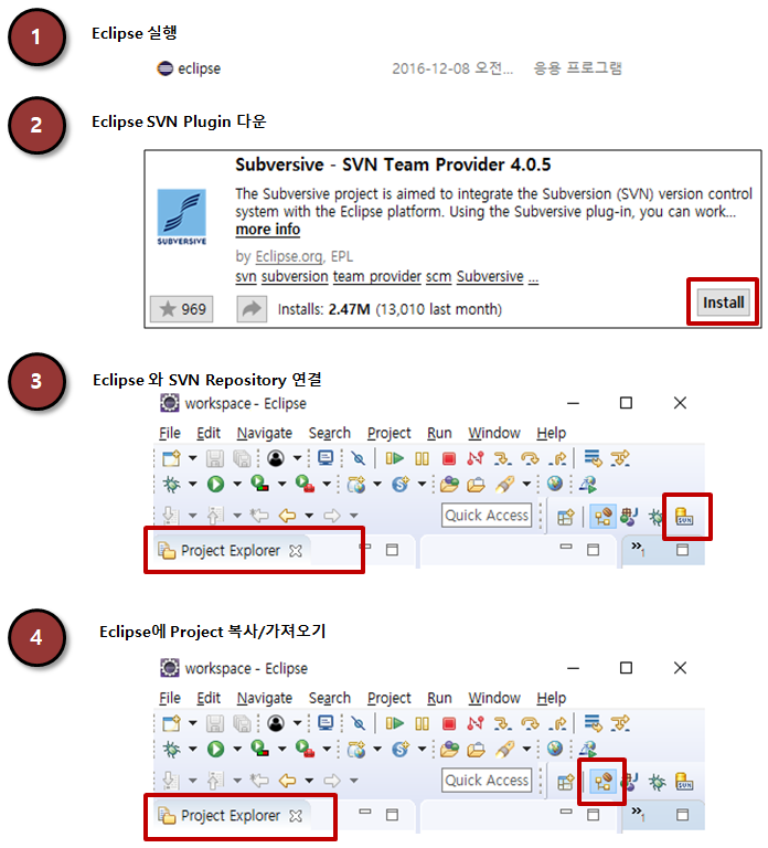 svn에 올려놓은 프로젝트(project)가 Eclipse로 개발되었을 경우, 본인의 로컬 PC에서도 동일한 환경으로 Eclipse를 세팅한 후, 이 IDE를 사용해서 개발할 것이다. 해당 svn에서 command tool이나 TortoiseSVN로 다운받아서 import한 후 사용할 수도 있지만, Eclipse에서 svn을 위해 제공되는 기능을 사용해서 연동하는 방법을 설명한다.
