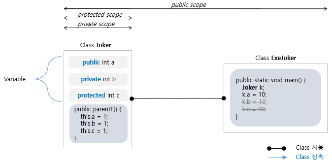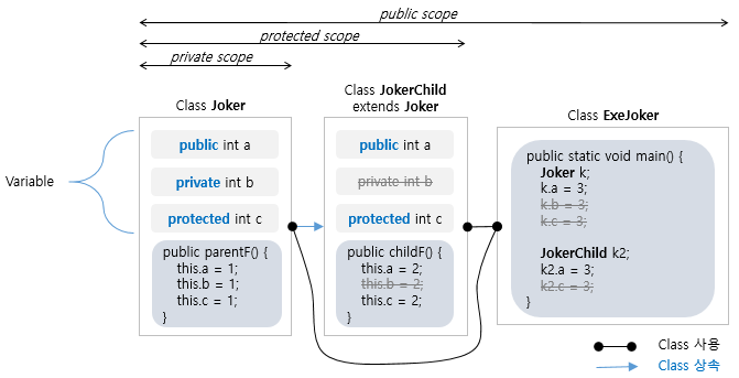 아래 그림은 하나의 Class(=Joker Class) 내에 변수 3개에 대해 각각 다른 접근제어자들을 사용한 것이다. 그리고 해당 Class를 사용하려는 다른 Class(=ExeJoker Class, JokerChild)들이 어떤 변수들까지 접근을 할 수 있는지 설명하는 내용이다.