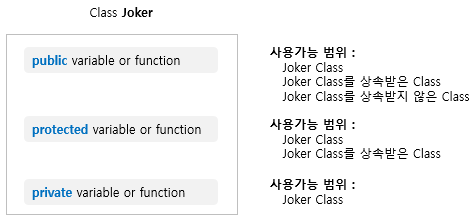그림처럼 하나의 Class(=Joker Class) 안에 public, protected, private 를 사용해서 정의한 변수와 함수들이 있을 때, 각각에 대해서 접근할 수 있는 범위가 다르다.