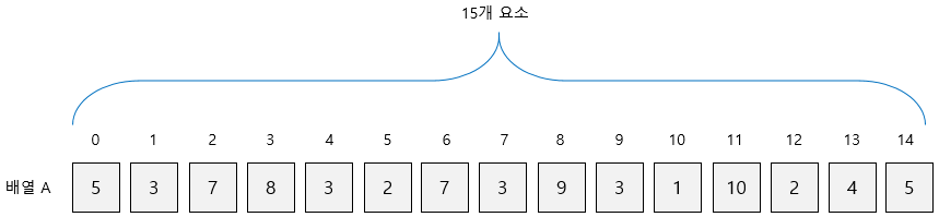 랜덤값으로 초기화 배열을 도식화하면 아래처럼 그려진다. 나 같은 경우는 배열 크기를 15개로 고정시키고 랜덤값은 직접 아무거나 적어서 초기화했다. 코딩을 할 때 특히, 배열을 사용할 때는 배열의 값을 가져오기 위해 위치를 잘 생각해서 코딩해야한다. 헷갈리지 않도록 아래 그림처럼 배열은 0부터 시작한다는 것을 잘 알아두길 바란다.
