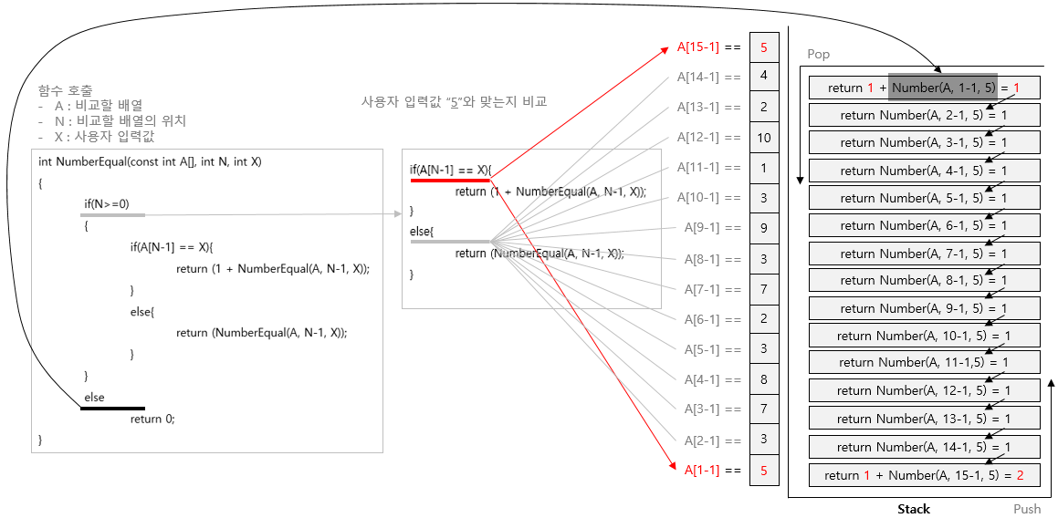 A[i-1]==X 문장은, 재귀함수 내에서 카운트(=개수세기)하기 위해, 1을 증가시키는 조건으로 사용한다. 작성된 풀이코드에서는 A[i-1]==X 문장으로 동일하게 사용하였다. 그리고 조건이 맞을 경우 1을 증가시킨 후 리턴하고, 조건이 틀릴 경우 증가값 없이 리턴하도록 하였다. 이 코드에 의해 사용자가 입력한 값과 배열의 요소값이 동일할 때만 1이 증가해서 리턴하게 되며, 결과적으로는 마지막에 리턴하는 함수는 누적된 값을 리턴하게 된다.