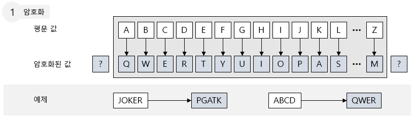 암호화하는 방법은 A는 Q로 치환하고, B는 W로 치환하는 형태로 Z까지 주어진 조건에 맞게 치환하는 것이다. 이 방법대로 암호화를 수행할 때, 예를들어, 사용자가 "JOKER"라는 단어를 입력하면 이 값은 "PGATK"로 암호화되는 것이다. 같은 방법으로 사용자가 "ABCD"를 입력하면 "QWER"로 암호화가 되는 것이다.