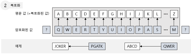 복호화하는 방법은 암호화하는 방법과 반대로 수행하면 되는 Q를 A로, W를 B로 치환하는 형태로 수행하면 된다. 이 방법대로 복호화를 수행하면, 사용자가 "PGATK"를 입력하면 "JOKER"로, 사용자가 "QWER"을 입력하면 "ABCD"로 복호화되는 것이다.