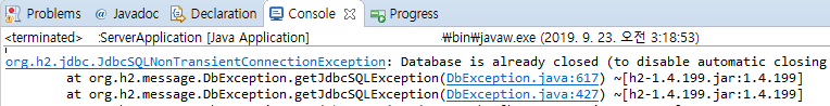 작성자는 Spring Boot 를 사용해서 개발 중이다. 서버 프로젝트 2개를 병합하는 작업을 하던 중에 위 처럼 JdbcSQLNonTransientConnectionException 라는 에러가 발생했다. 에러가 발생한 정확한 시점은 (Run As > Java Run Application을 클릭해서) Java 서버 프로그램을 실행시키던 도중 런타임(Runtime)으로 발생한 것이다.