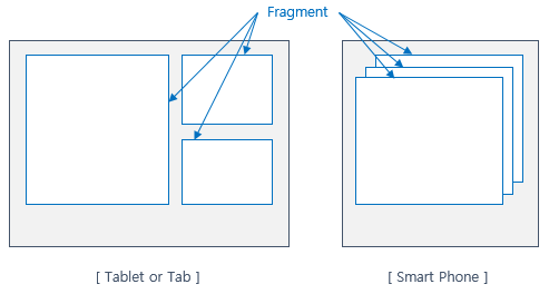 Fragment는 스마트폰(Smart Phone)이 아닌, 스마트폰 보다는 조금 더 큰 탭이나 태블릿의 화면을 좀 더 효율적으로 사용하기 위해 등장한 안드로이드 API 중 하나입니다. 태블릿이 활성화되기 전에 스마트폰만 사용할 때는 Activity만으로 화면제어가 충분했지만, 갤럭시 노트(Galaxy Note)나 갤럭시 탭(Galaxy Tab)처럼 화면이 큰 디바이스들이 등장하면서 Activity 하나로는 화면의 UI를 제어하기가 불편해진 것이죠. 그래서 Android는 하나의 화면 단위인 Activity를 조금씩 쪼개서 부분별로 제어를 가능하게 할 수 있는 Fragment를 제공하기 시작했습니다.