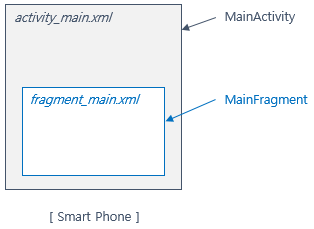 아래는 스마트폰위에서 Fragment를 사용해서 개발하는 경우 사용될 수 있는 기본 구성 중 하나입니다. 설명하는 코드는 총 4개의 파일로 구성되어 있습니다. 우선, 하나의 Activity 만든 후, 그 안에 하나의 Fragment 를 만드는 코드입니다.