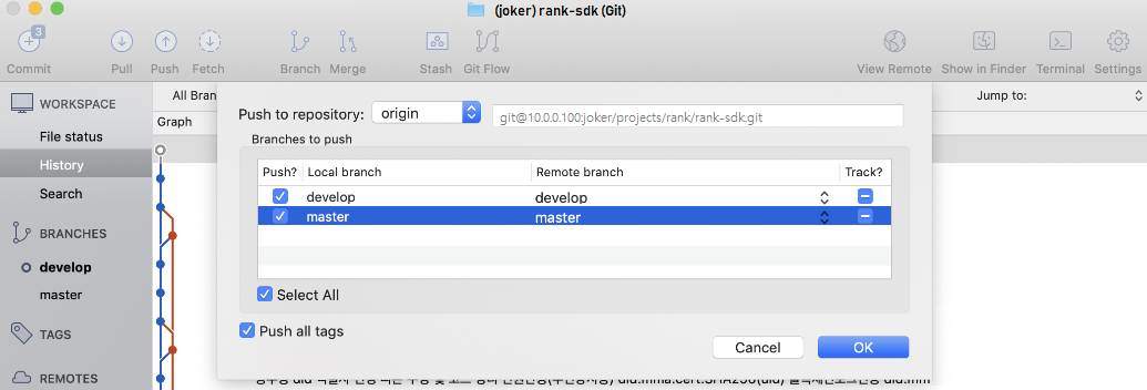 ※ delveop과 master 모두 체크하는 이유는 기존 gitlab에서 두 브런치의 코드 모두 이동시킴으로써, 새로운 GitLab 서버에는 최신코드를 유지시켜줄 수 있기 때문입니다.