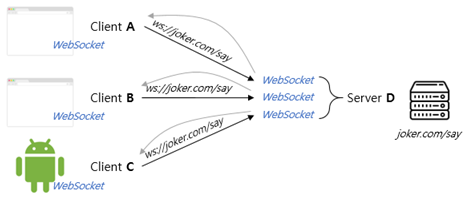 웹 클라이언트인 A, B, C는 모두 서버 D와 통신하기 위해 "ws://joker.com/say"로 접속요청을 하고 있는 것을 볼 수 있습니다. 클라이언트는 서버에서 웹소켓을 위해 열어둔 해당 주소로 메시지를 보낼 수 있습니다. 반대로,서버가 접속된 클라이언트의 웹 소켓을 통해 메시지를 보낼 수 있죠. 이렇게 서로 웹 소켓이 연결되어 있다면 이를 통해 서로에게 원할 때 메시지를 보낼 수 있는 양방향 통신을 할 수 있게 되는 것입니다.
