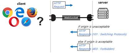 웹 소켓은 클라이언트를 웹 브라우저를 사용해서 운영될 경우, header의 origin정보를 확인함으로써, 악성 javascript를 걸러낼 수 있습니다. 이 말은 웹 브라우저에서 기존에 사용하고 있던 동일 근원 정책(Same-Origin Policy)을 통해 악성 리소스(resource)로부터 보호할 수 있다는 것입니다.