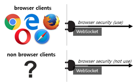 웹 소켓은 클라이언트를 웹 브라우저가 아닌 다른 곳에서(ex, android, ios, windows) 운영될 경우, 악성 resource(ex, 악성 javascript)로부터 보호를 할 수 없으므로, 클라이언트와 서버는 이를 고려해서 사용해야 합니다. 웹 소켓은 웹 브라우저 위의 웹 페이지를 통해 사용되는 환경에서 운영되는 프로토콜로 만들어진 것이기 때문에, 웹 브라우저가 아닌 다른 클라이언트에서는 Same-Origin Policy와 같은 정책들을 전혀 사용할 수 없는 것이죠.