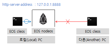 EOS config.ini 파일에 http-server-address 의 기본값은 127.0.0.1로 설정되어 있다. http-server-address는 EOS Node에 http로 접근할 때 어디까지 허용할지에 대한 주소를 설정하는 속성값이다. 기본값이 127.0.0.1이므로, 이대로 동작된다면 로컬(Local)로부터의 http요청만을 허용하겠다는 의미이다.