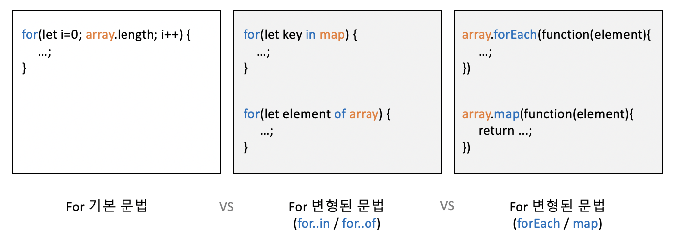 javascript에서도 일반적으로 프로그래밍 언어에서 제공하는 반복문인 for문을 사용할 수 있다. 그런데, 오픈 소스들을 찾아보면 for문이 조금 다르게 생겨서 별것도 아닌데 형태가 다르다보니 이해가 바로 안될 수 있다. javascript 같은 경우에는 for문을 변형된 다른 몇가지 형태로도 제공하고 있으니, 잠깐 시간을 두고 살펴보고 넘어가는 것이 javascript 코드를 보는데 속이 편하다.