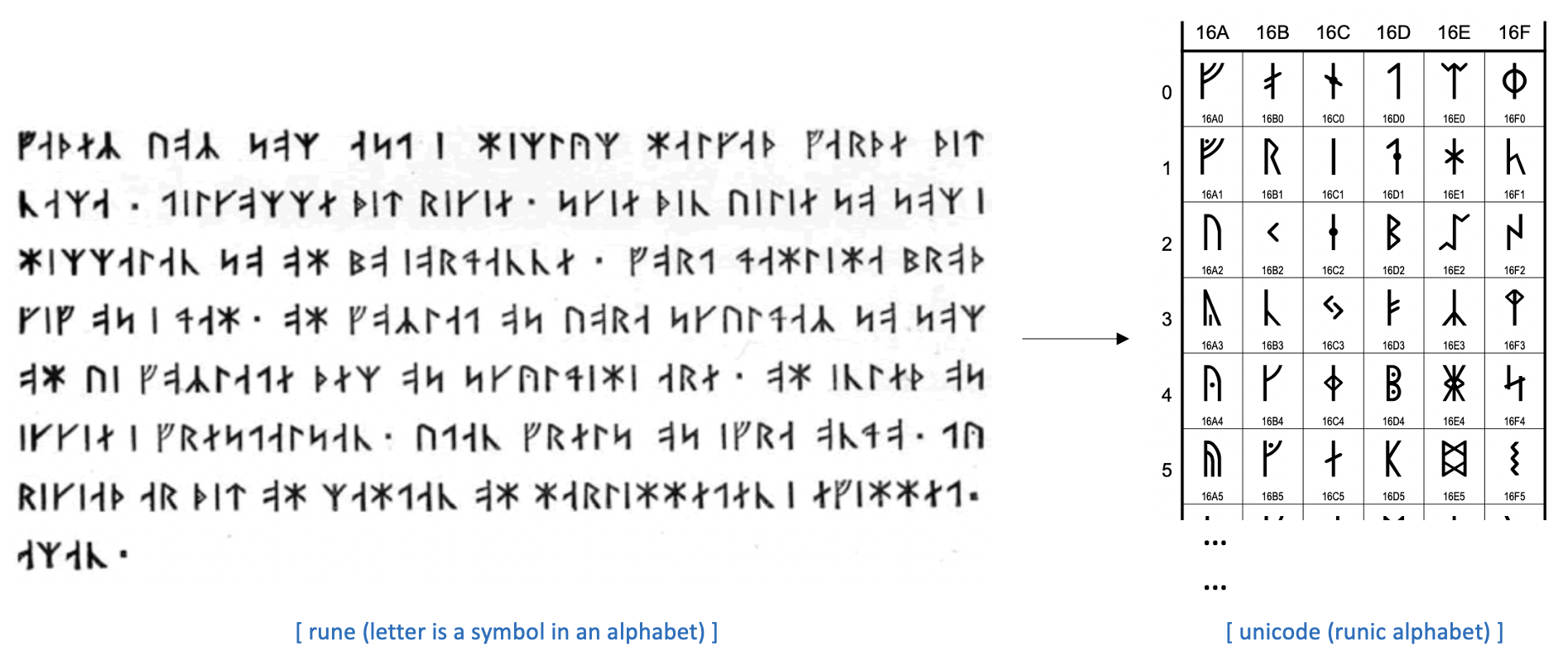 rune 타입은 다른 언어에서 잘 볼 수 없는 타입이다. 타입의 이름을 왜 rune으로 정의했을까 궁금증으로 찾아보니, 룬 문자(runic alphabets)에서 가져온건 아닐까 생각된다. 룬 문자는 옛날에 북유럽의 게르만족(=독일사람)이 라틴문자를 사용하기 전에 사용되던 문자라고 한다. 아래 첨부한 그림에 포함된 글이 룬 문자로 작성된 것이라고 한다. 바로 이 문자를 컴퓨터로 표현할 수 있는 인코딩 타입 중 하나가 유니코드이다. 룬 문자에 대한 유니코드가 U+16A0 ~ U+16FF 사이에 정의되어있기 때문에, 개발자가 원한다면 프로그램 위에 출력시킬 수도 있다. 이러한 정황들을 봤을 때, 개인적으로 잠깐 "go언어를 설계한 사람이 언어를 전공한 친구에게 컴퓨터에 모든 문자를 표현할 수 있는 타입이 하나 있는데 작명을 부탁한 후, runic alphabet을 의미하는 rune이라는 이름을 받아오진 않았을까"생각해봤다.