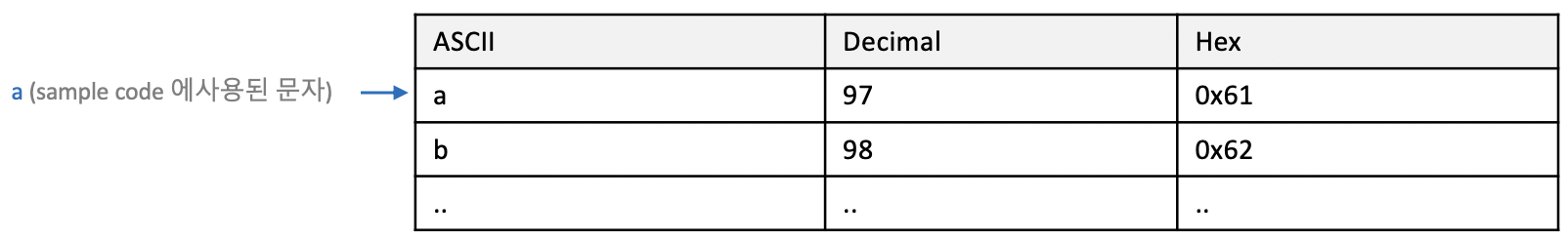 8bit 인코딩 방식이라는 것을 주의한다. 첫 비트는 0으로 시작하고 나머지 7개 비트로 표현하는 방식이다.