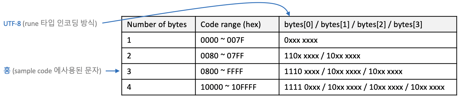 아래 코드는 rune 타입을 사용한 몇가지 코드들이 작성되어 있다. '홍' 글자를 UTF-8 단위로 제어할 수 있는 rune 타입을 사용한 예제이다. '홍' 글자를 unicode 표에서 찾아보면 U+D64D에 해당하는 것을 알 수 있다. 이 값을 코드로 작성하면 '\ud64d'로 표현할 수 있다. 참고로, 아래 예제 코드는 go language 기준으로 작성되었으니 다른 언어는 조금 다를 수도 있다는 것을 알아두자. 아래 코드를 실행하면 UTF-8 인코딩 기준의 '홍'값을, 10진수로 표현하면 54861이라는 값을 가지고, 한글 문자이므로 3byte가 필요하기때문에 출력도 동일하게 되는 것을 알 수 있다. 참고로, 영어 알파벳 문자인 'a' 값은 1byte가 필요하다.