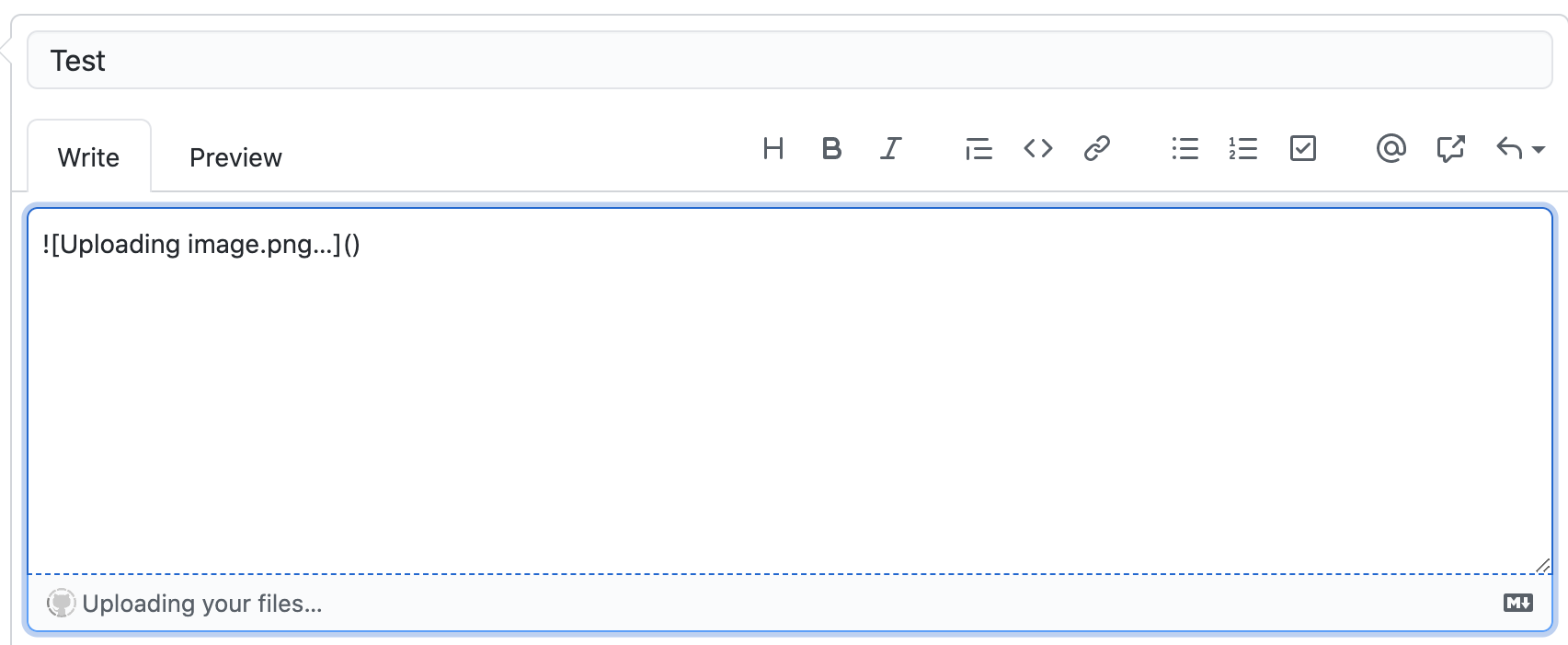 우선, Issue 글 작성하기를 눌렀다면, 아래처럼 글을 쓰는 공간에 이미지를 복사(Ctrl+C) & 붙이기(Ctrl+V)를 하거나 이미지 파일을 드래그(Drag) & 드롭(Drop)을 하면 된다. 붙이기를 하면 아래 캡처한 화면처럼 사진이 바로 삽입되는 것이 아니라, "![Uploading <업로드할 image>]()" 라는 문자열이 잠깐 동안 삽입이 되는 것을 확인할 수 있다. 이 문자열과 동시에 하단에 "Uploading your files..." 라는 표시가 나온다. 업로드 하는 사진의 용량에 따라 시간이 다르게 나오는데, 이 때, 알아두어야할 점은, png 이미지로 변환해서 올려진다는 것이다. 만약에 올리려는 사진의 확장자가 png 가 아닌 jpg, jpeg 등의 다른 확장자라면 png로 올라갈 것이다. 아마도 Github 에서 Issue와 PR에 올리는 사진은 참고용으로만 작성하는 것이기 때문이라고 가정하고 원본 파일을 올리지 않는 것 같다.