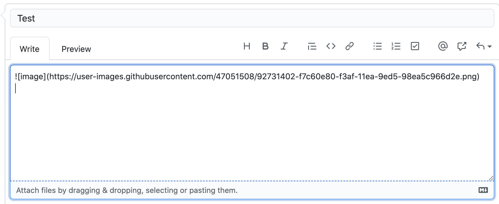 약 1~5초 정도가 지나면 화면 문구가 "" 형태로 변환될 것이다. 이때, <업로드된 url>은 실제로 주소창에서 호출하면 해당 이미지가 뜨기 때문에 Github는 특정 공간에 저장시키는 것을 알 수 있다. 주소가 내 Git Repository 주소가 아니기 때문에 아마도 시간이 어느정도 지난후 Image를 포함하는 Issue나 PR이 필요없어질 때 쯤? 아니면 Git Repository가 삭제되면? 등의 특정 시간에 제거되지 않을까 생각된다. 하지만, 일반적으로 Issue나 PR은 오랜시간 동안 유지되는 글이 아니기 때문에, 상관없을 것이다.