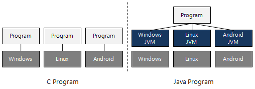 Java가 C언어와 가장 큰 차이 중 하나는 자바가상머신이다. 다른 언어로 만든 프로그램은 Window, Linux, Unix 중 돌아가는 운영환경에 맞게 각각 컴파일을 해주어야 한다. 다시 말해서, 하나의 프로그램을 만들 때, Window용으로 만들던가 Unix용으로 만들던가 해야된다는 이야기이다.